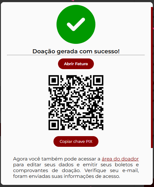 • QR Code dinâmico e link Pix prontos na Página de Doação.