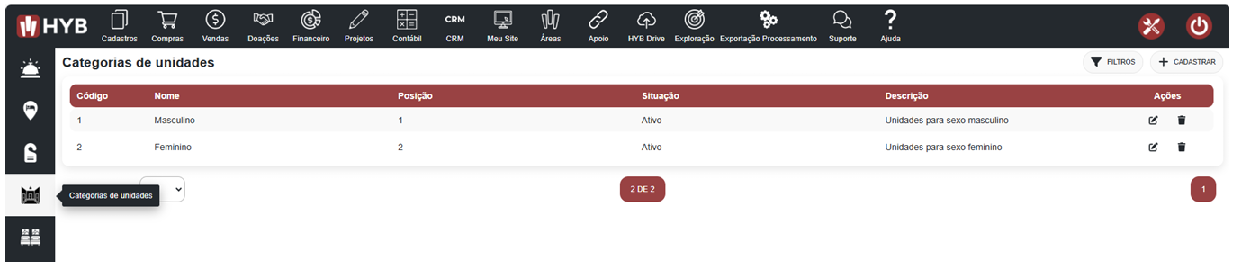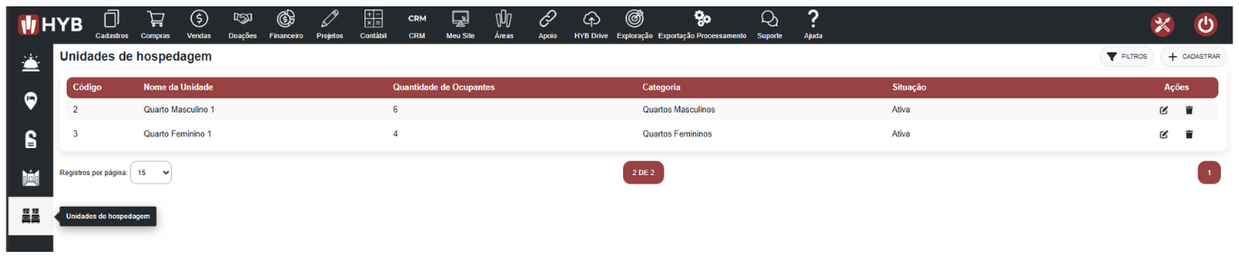 Tudo começa com o cadastro das categorias de unidades, que funcionam como agrupadores para os diferentes tipos de acomodações que sua OSC oferece, por exemplo: “Quarto Feminino”, “Suíte Individual”, etc.