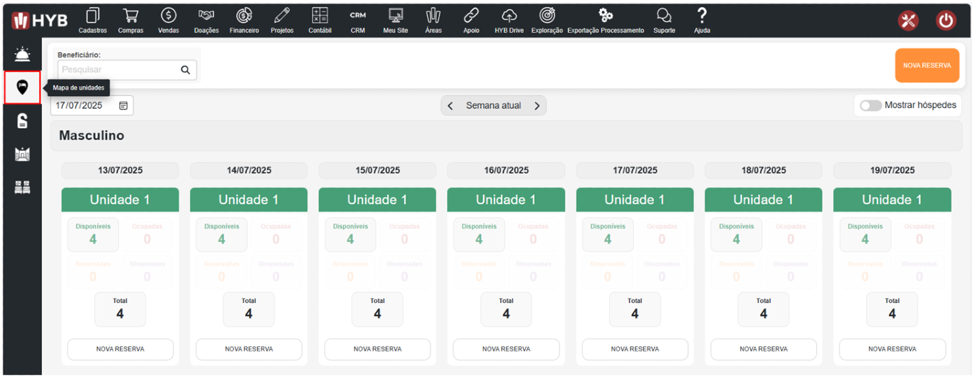 Com as unidades cadastradas, você pode acessar o Mapa de Unidades, uma visualização em formato de calendário semanal que mostra todas as unidades e suas ocupações ao longo dos dias.