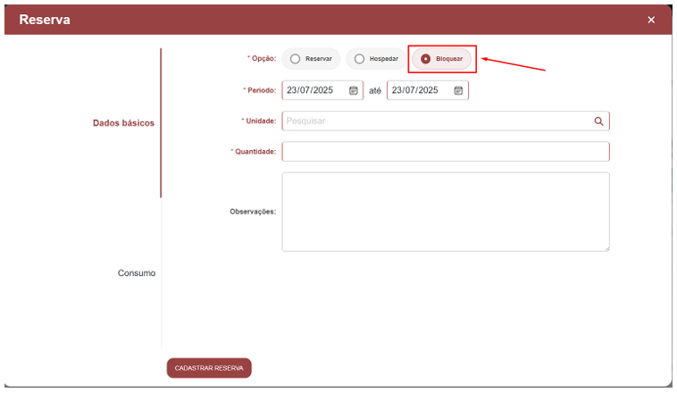 No próprio mapa ou no menu de reservas, é possível cadastrar novas estadias. A tela de reserva permite: