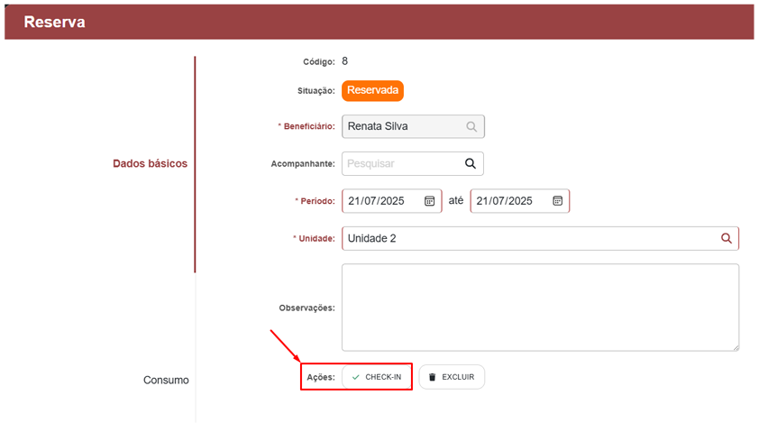 Quando o hóspede chega, basta localizar a reserva no mapa e realizar o check-in. O sistema atualiza automaticamente o status da unidade para “ocupada”.