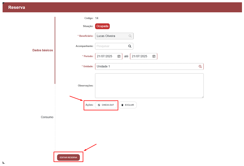 Na saída, após finalizado qualquer consumo registrado (como refeições ou produtos), o sistema permite fazer o check-out da pessoa, liberando novamente a unidade.