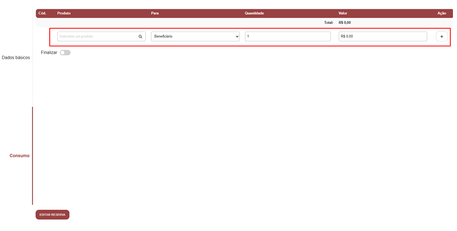 Durante a estadia, é possível registrar tudo o que o hóspede consumiu. Basta acessar a reserva e inserir os itens (já previamente cadastrados no módulo de Compras). Isso inclui produtos (alimentação, higiene, vestuário), etc.