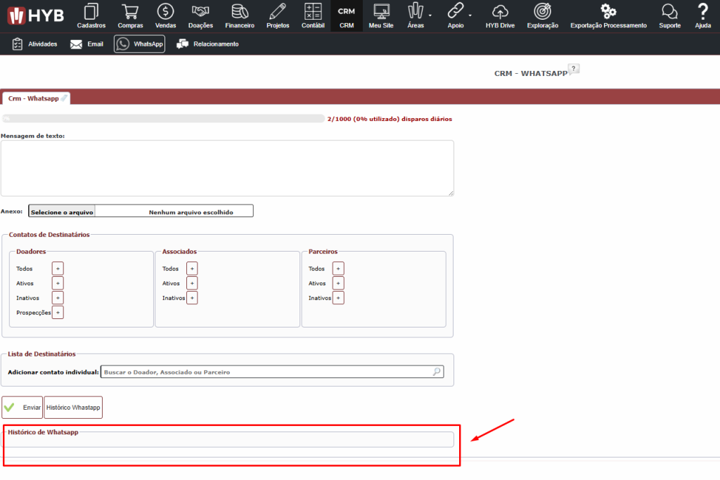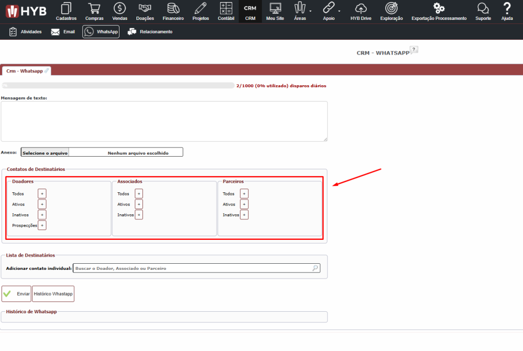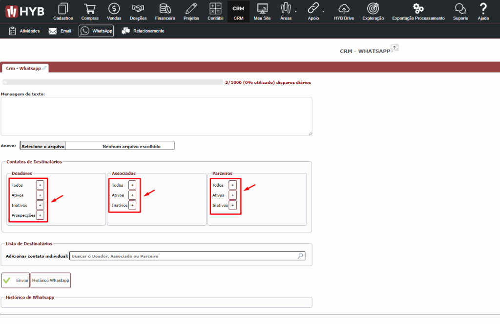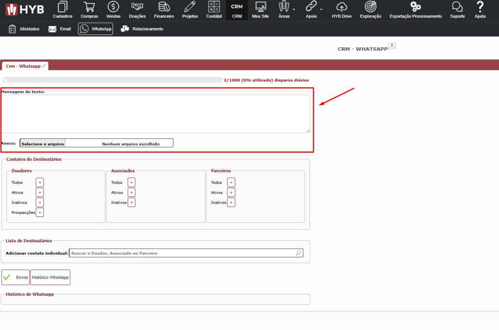 No módulo CRM do HYB, o WhatsApp está totalmente integrado às estratégias de relacionamento. Pelo sistema, as OSCs podem: